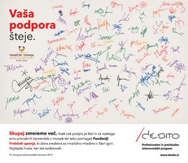 Da bi dobrodelnost ostala del našega vsakdana in vrednota mnogih smo jo dodali tudi na kongres. Skupaj s številnimi podpisi udeležencev kongresa smo donirali Fundaciji Vrabček upanja, ki zbira sredstva za invalidno mladino v Stari gori . Najlepša hvala še enkrat za vaše sodelovanje .